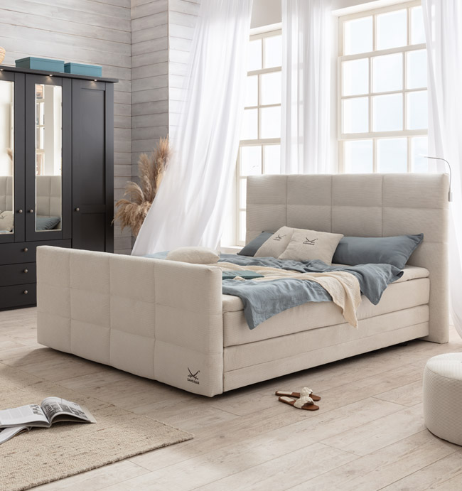 Die Boxspringbetten der Serie LANGEOOG sind so vielfältig schön wie ein langer Urlaub am Strand mit Sylter Wetter.